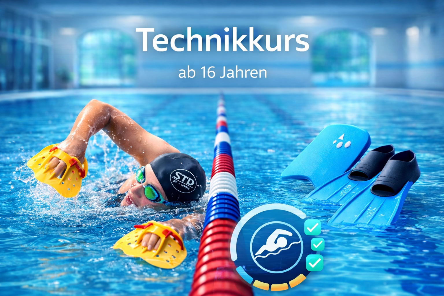 Der Kurs richtet sich an Erwachsene (ab 16 Jahre), die mind. 200 m am Stück schwimmen können und gezielt Ihre Schwimmtechnik verbessern wollen. Die Teilnehmer*innen sollten zumindest eine Schwimmart (z.B. Brustschwimmen) sicher beherrschen. Sie werden in diesem Kurs Ihre Technik in den verschiedenen Schwimmarten verbessern bzw. neu erlernen. Dabei legen wir den Schwerpunkt auf das Kraulen. Sehr ambitionierte Teilnehmer*innen können sich auch gerne am Delfinschwimmen ausprobieren. Durch verschiedene Technik- und Koordinationsübungen frischen wir Ihre Technik auf. Nebenbei wird auch noch Ihre Kondition sowie Koordination verbessert. Sie werden mit weniger Kraftaufwand schneller und ausdauernder schwimmen können.